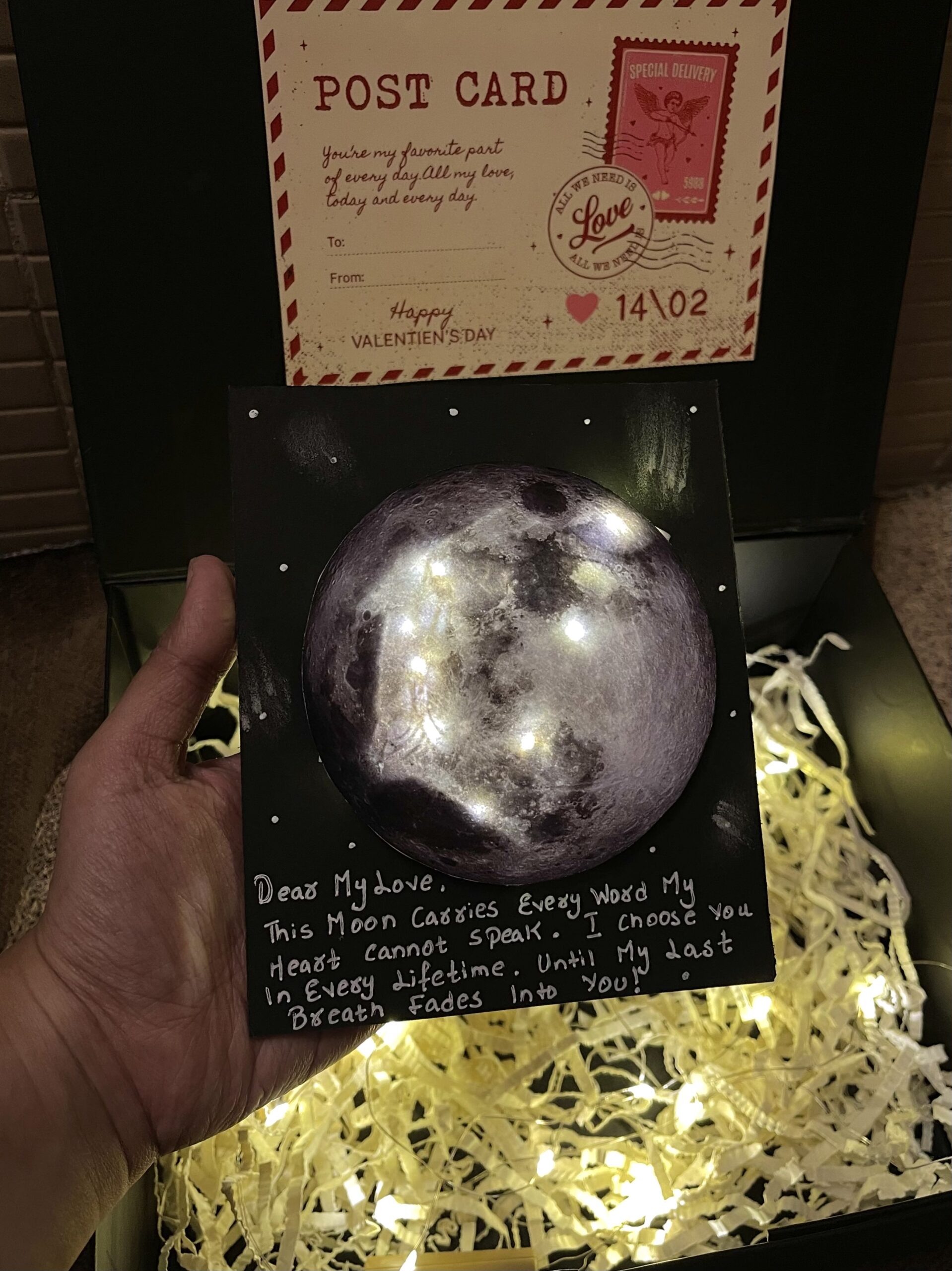 You can’t bring the moon down, but we’ve got something close. Our Small Moon Card lights up!